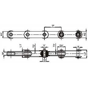 Minimum tensile in Ibs Pitch ('P') Width between Inner Plates ('W') (Min) Large roller Dia ('D1') Bush Dia ('D') Hollow Pin bore ('C') (Min) Hollow Pin Dia ('d) Hollow Pin length ('L1') (Max) Connecting pin length ('L2') (Max) Inner Plate Outer Plate Avg Wt/Mtr In (Kg)
